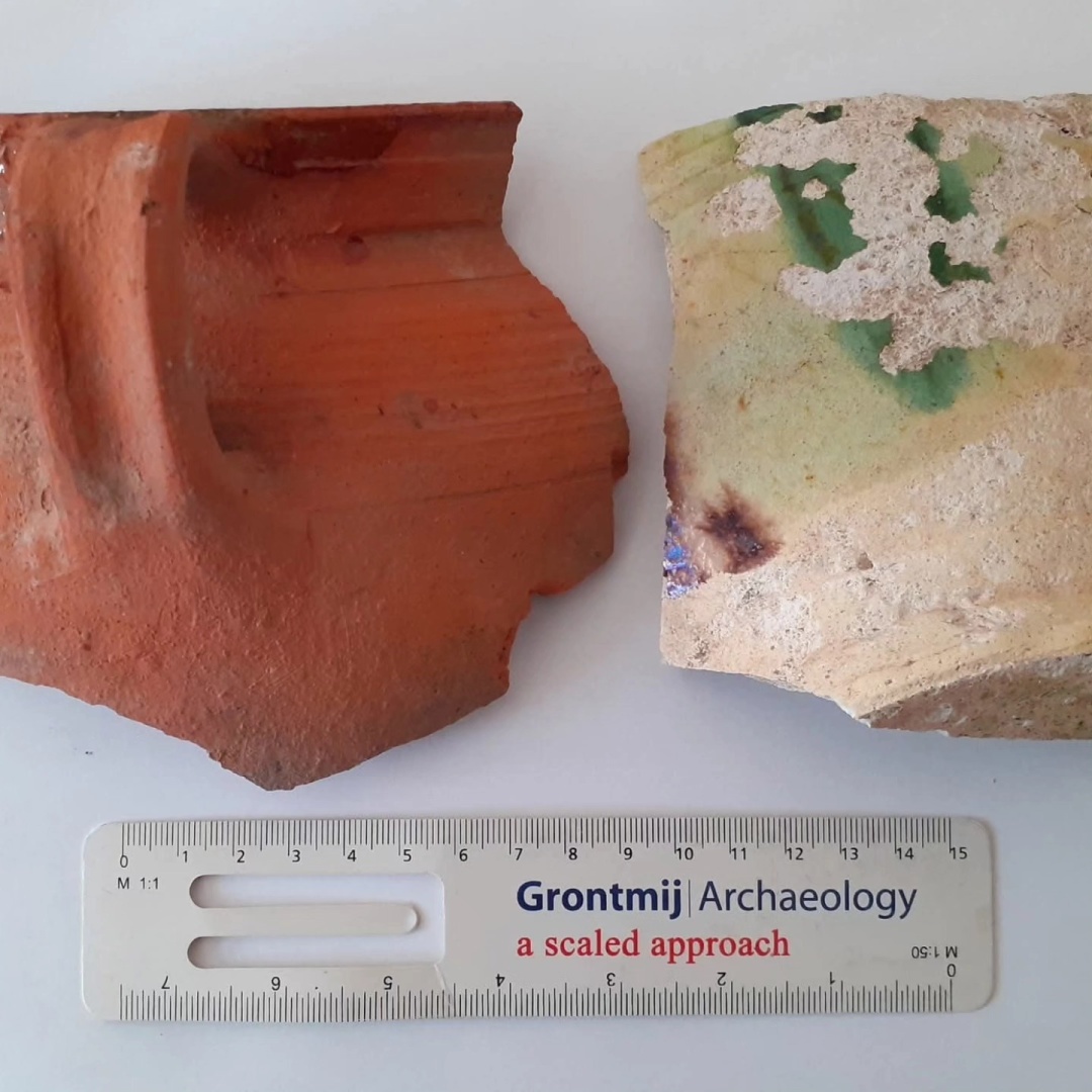 За його даними, археологи знайшли фрагменти кахлів від п’єців (старовинних печей), покритих поливою (особливий склоподібний сплав, що використовується для покриття керамічних виробів) білого-синього, світло-зеленого та темно-зеленого кольорів із витонченим рослинним орнаментом, а також частини керамічного посуду, оздобленого світло-зеленою, зеленою та коричневою поливою.