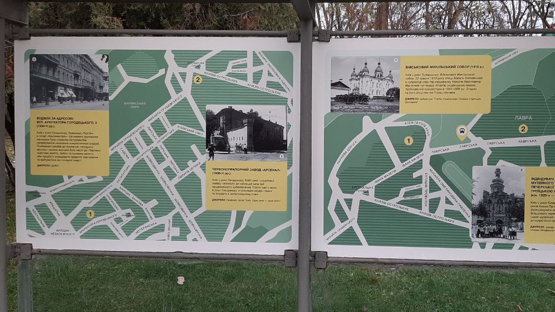 Проєкт розміщений на маршруті, що веде від вулиці Лаврської до Залізничного вокзалу. На банерах представлені архівні фотографії та короткі довідки про Києво-Печерську лавру, яка в 1926 році була перетворена на Всеукраїнський музейний городок, зруйнований Військовий Микільський собор, завод «Арсенал», магазин «Торгзін» на вулиці Архітектора Городецького, Бессарабський ринок, Галицька площа та вокзал.