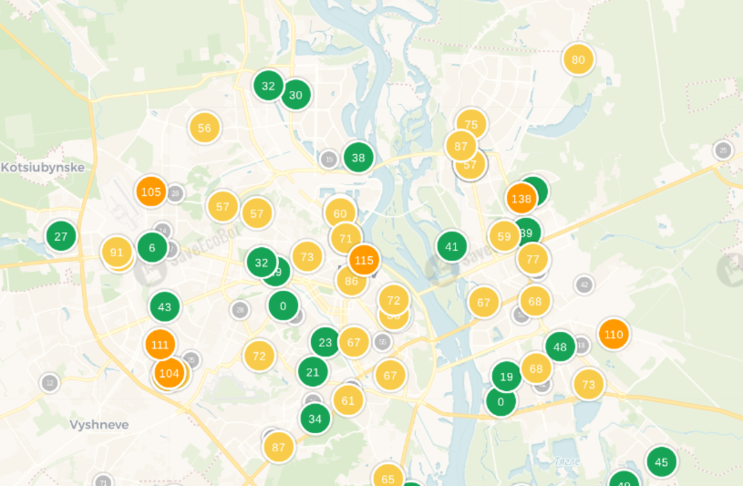 • Святошинський район, вулиця Вахтанга Кікабідзе, 18. Індекс забруднення – 104