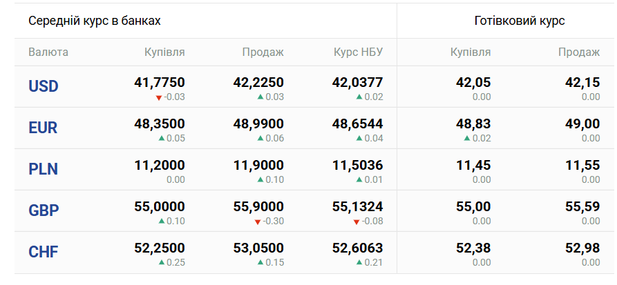 у monobank: 41,80 – 42,19 грн/$ та 48,33 – 49,00 грн/EUR.