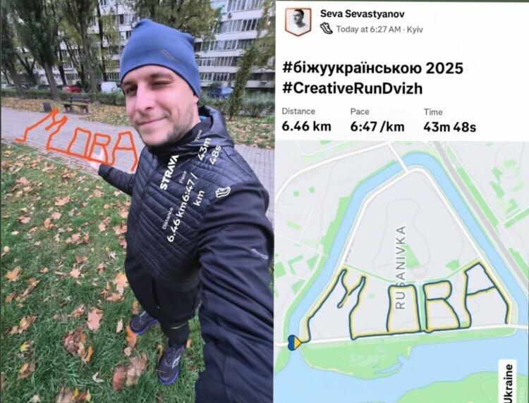 Спортсмен із Києва та ініціатор проєкту #CreativeRunDvizh Всеволод Севастьянов пробіг містом, створивши GPS-малюнок «Мова», що символізує силу, віру ідентичність українців.