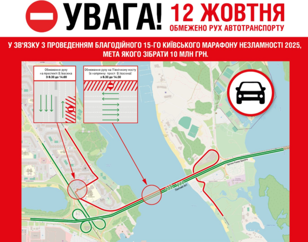 Організатори закликають жителів та гостей Києва з розумінням поставитись до тимчасових обмежень та заздалегідь планувати свої маршрути, враховуючи графіки закриття: