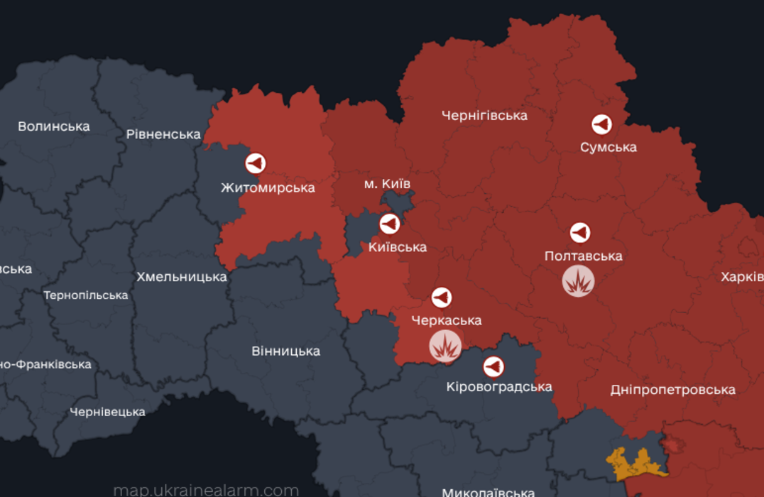 Відповідно до інформації Повітряних сил України, ворожі БпЛА були зафіксовані в передмісті Києва та прилеглих областях. Сирени продовжують попереджати про підвищену загрозу в небі на сході та в центрі України.