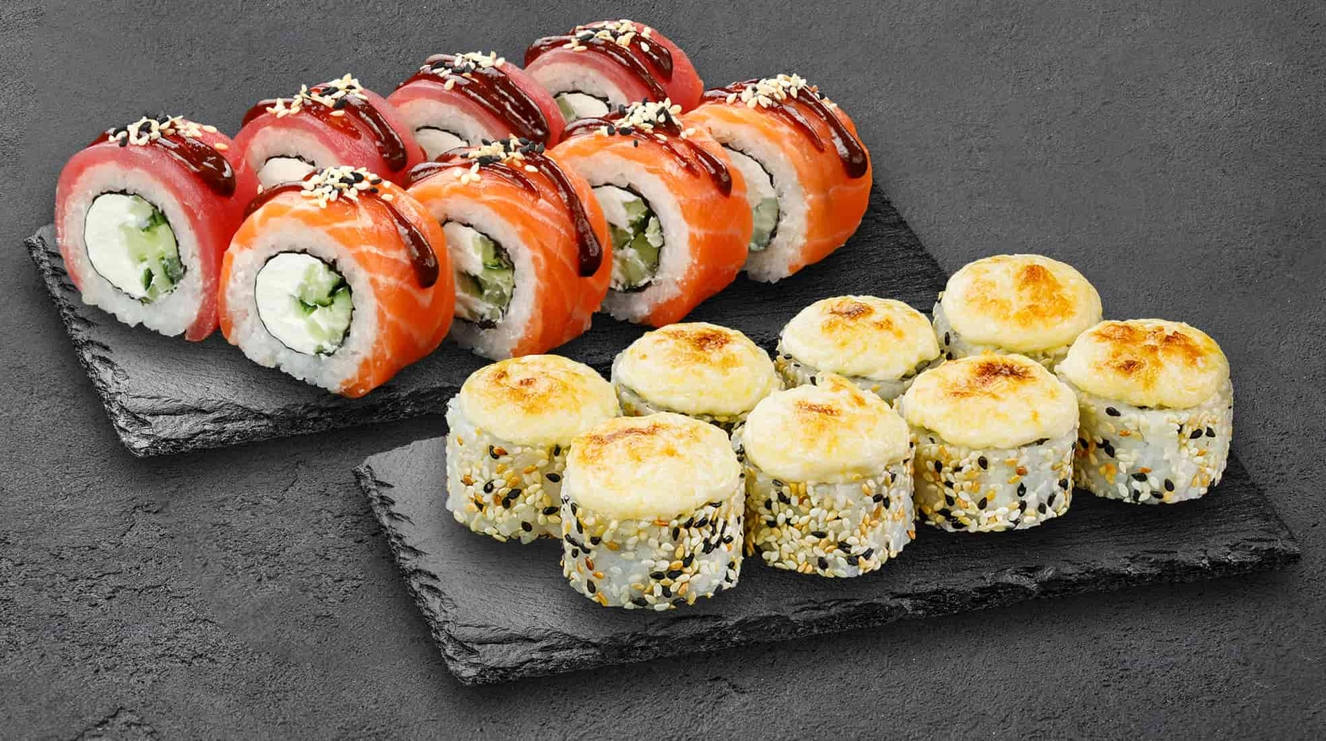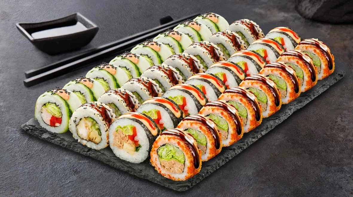 Для прихильників теплих страв створений сет Фьюжин вагою 950 грамів за 899 гривень. Основний акцент тут зроблено на запечених та темпура ролах, які особливо смакують у прохолодний осінній вечір. Хрустка скоринка темпура та ніжна запечена начинка створюють чудовий контраст текстур. У комплекті — 100 мл соєвого соусу, 50 грамів імбиру та 20 грамів васабі. Це вибір для тих, хто цінує комфортну їжу з яскравими смаковими відтінками.