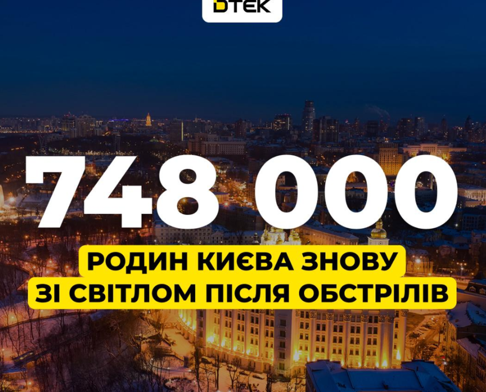 “Київ: 748 000 родин знову зі світлом після масованої атаки”, — йдеться у повідомленні ДТЕК.