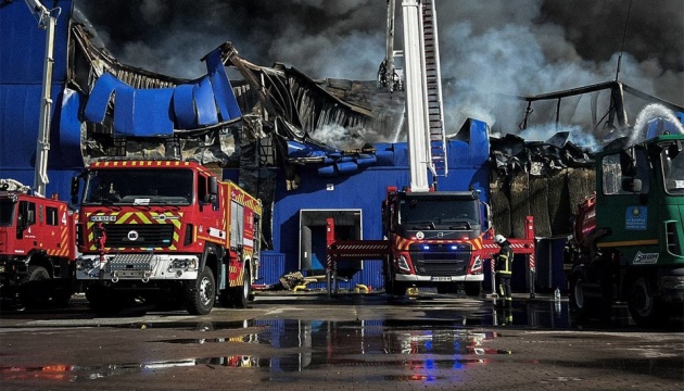 На Київщині рятувальні служби ліквідували пожежу на площі 17 тисяч квадратних метрів, що виникла внаслідок влучання ворожого дрона в складські приміщення логістичного центру компанії «Епіцентр».
