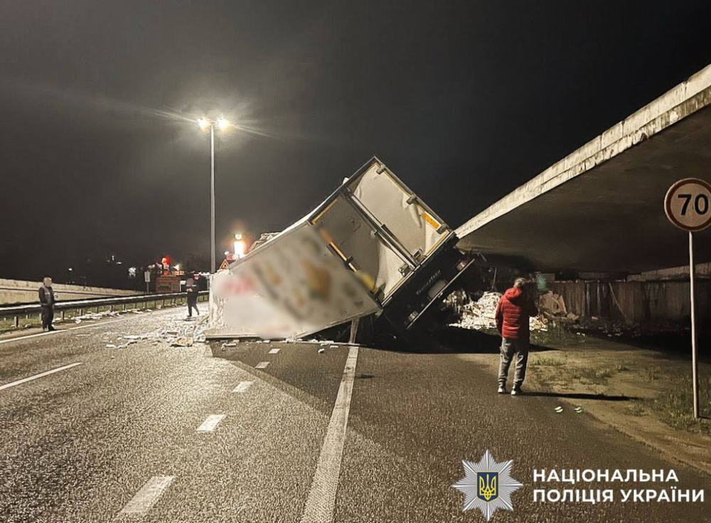 «Попередньо встановлено, що 39-річний водій вантажного автомобіля MAN з причепом MS-Parts, рухаючись у бік Києва, наїхав на опору мосту», — зазначили правоохоронці.