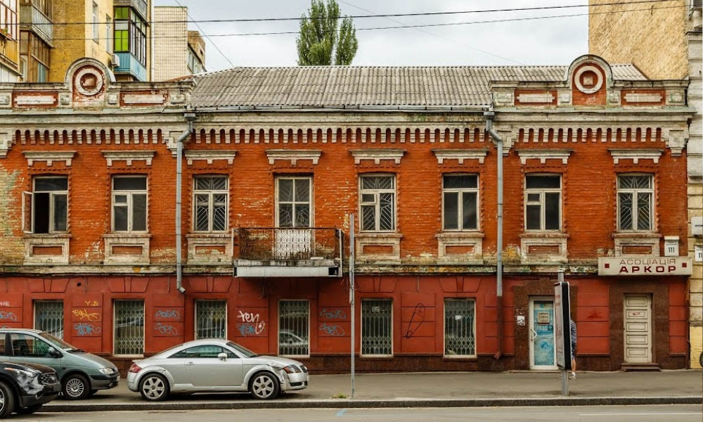 У самому центрі міста на місці садиби №111 на вулиці Саксаганського сьогодні — порожня ділянка: до 2014 року тут стояв двоповерховий будинок із багатою історією. Первісно одноповерхову споруду спорудили в 1860–1870-х роках, а в 1888 році їй надбудували другий поверх і надали оздоблення в рисах пізнього класицизму: карнизні сандрики над вікнами, декоративні панелі та аттики з люкарнами. Про цей об’єкт повідомляє проєкт «Київ, якого немає. Втрачені пам’ятки».