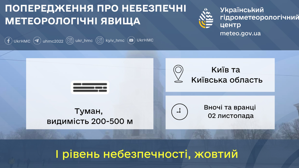 Завтра, другого листопада, вночі та вранці з’явиться туман. Про це повідомляє КМДА з посиланням на Укргідрометцентр