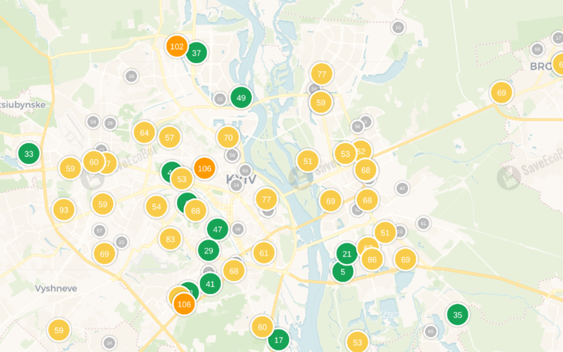 Після 18:00, найвищі показники забруднення повітря були зафіксовані у трьох районах Києва: